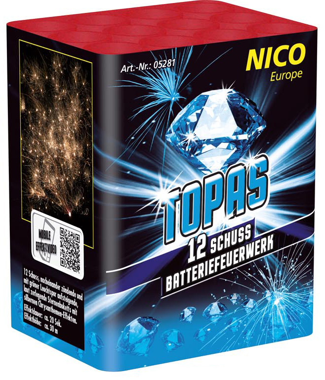 12 Schuss, nacheinander zündende und mit grüner Leuchtspur aufsteigende, laut zerlegende Sternenbuketts mit silbernen Chrysanthemen-Effekten.