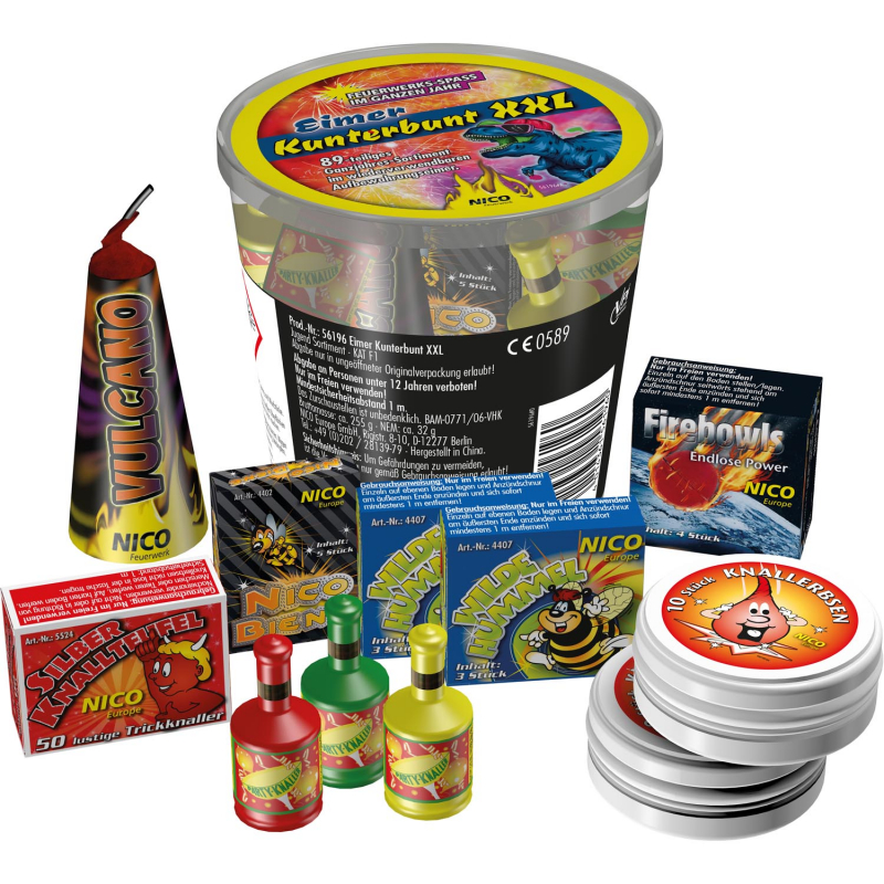 Freuen Sie sich auf jede Menge bunte Farben, putzige Effekte und viel Spaß! Dieser Eimer ist der ultimative Mix aus 89 Teilen. Das Ganzjahres-Feuerwerks-Sortiment im wiederverwendbaren Aufbewahrungseimer bietet die perfekte, bunte Mischung.