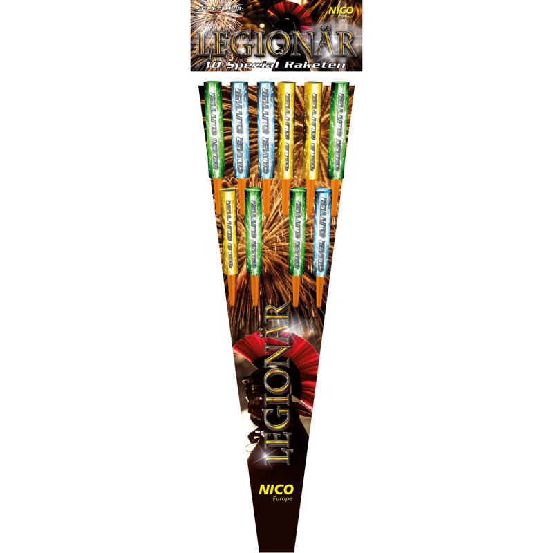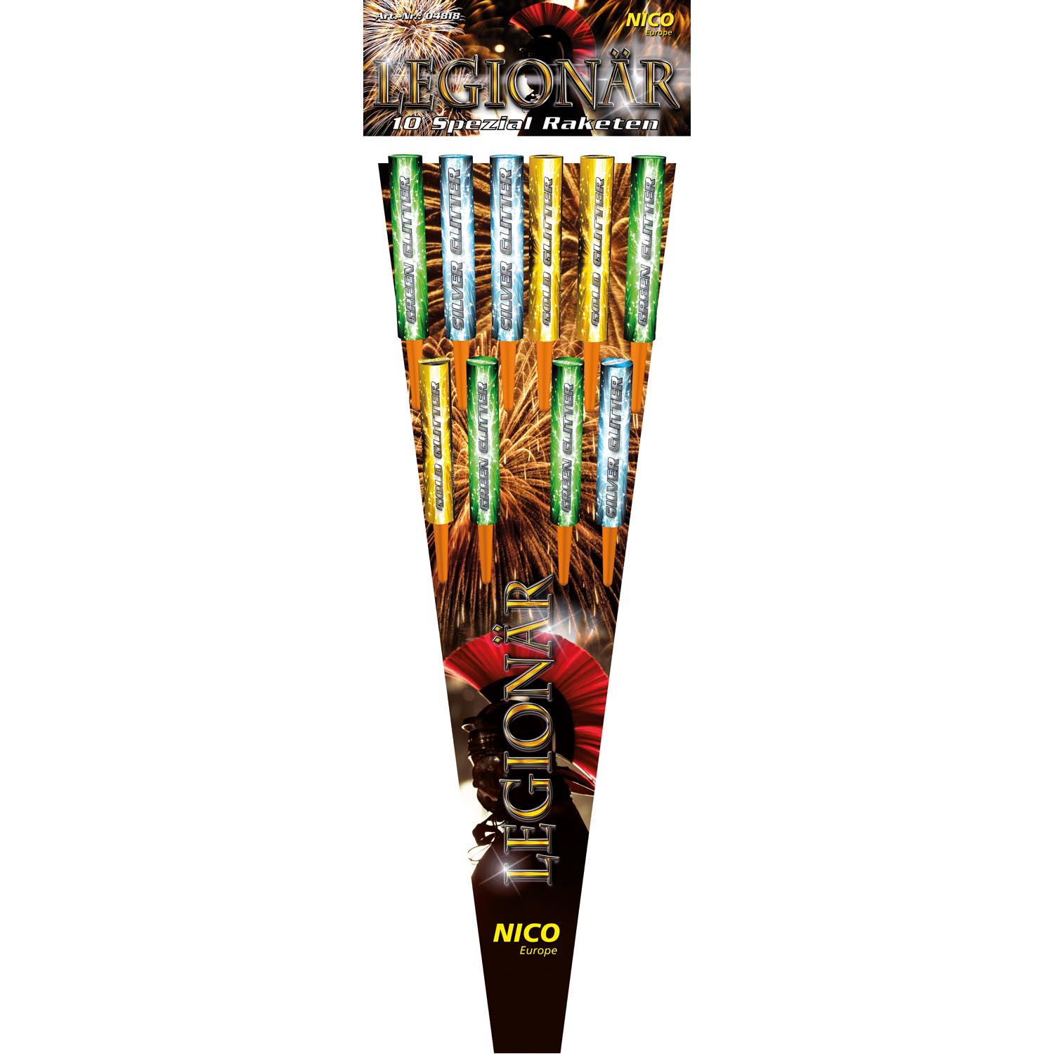 10 Spezial-Raketen mit grünem, goldenem oder silbernem Glittereffekt.
