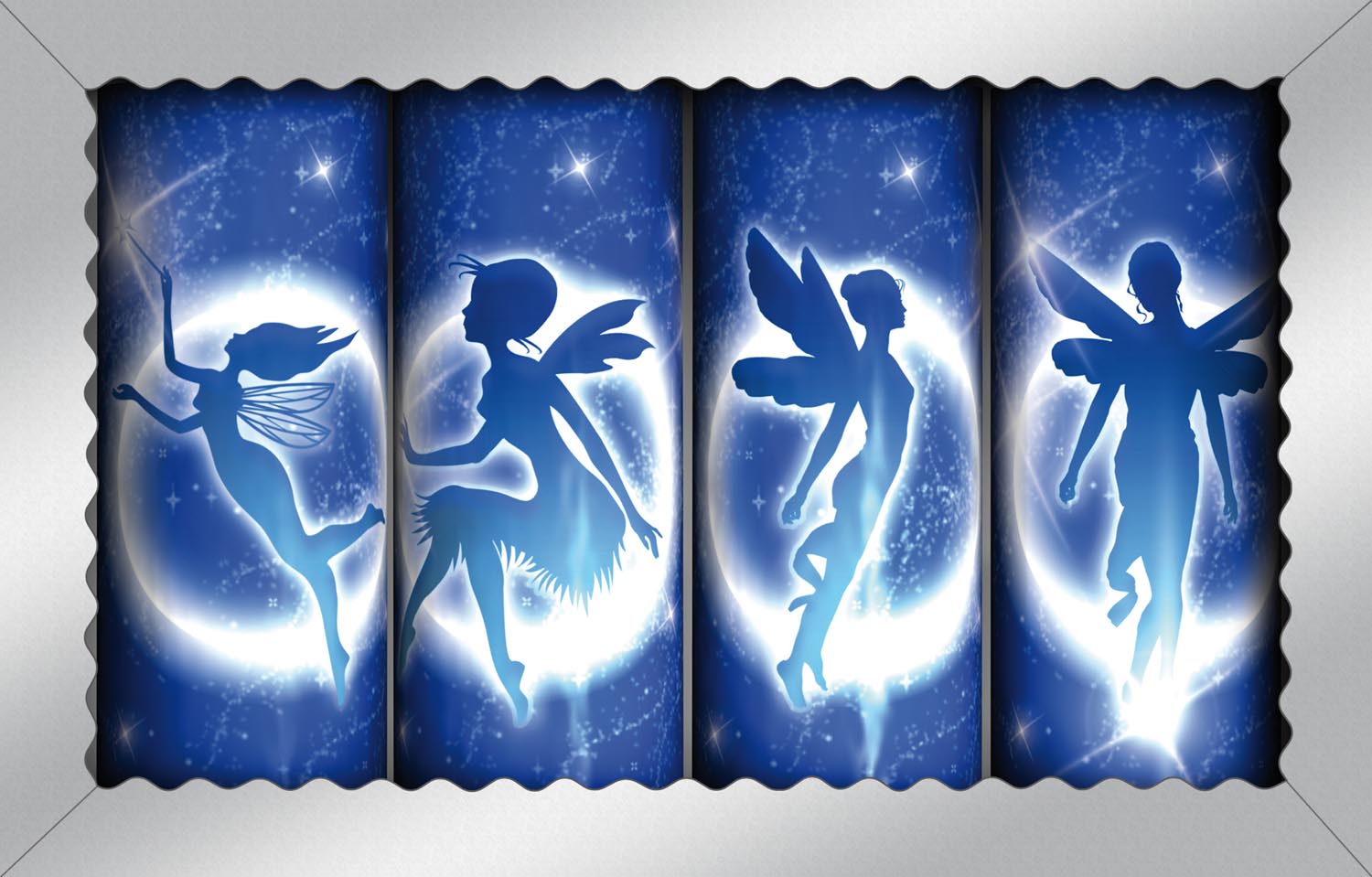 Eine Auswahl von 4 Tischbomben mit Feen-Motiven in einer silberfarbenen Schachtel.